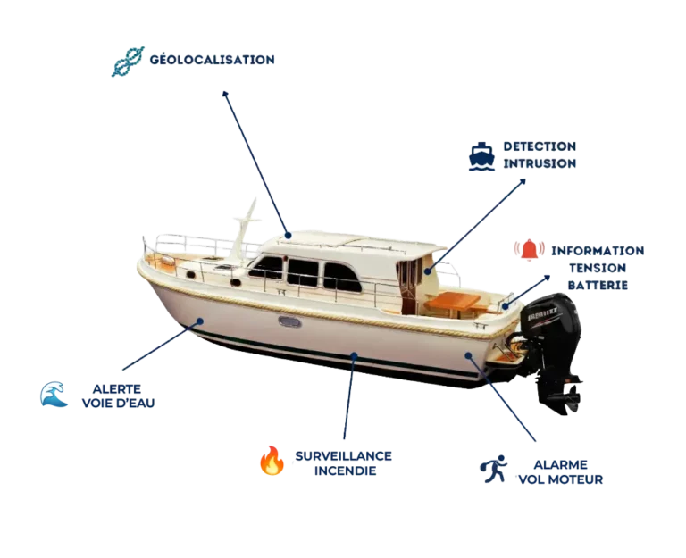 Le système comprend un capteur de détection de montée des eaux dans la cale du bateau, un capteur de détection de fumée, un lecteur de tension de la batterie du bateau, un capteur d’intrusion, un GPS et un anti-vol moteur.
